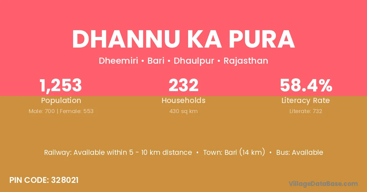 Dhannu Ka Pura village has a total population of 1,253 people, of which 700 are males and 553 are females.