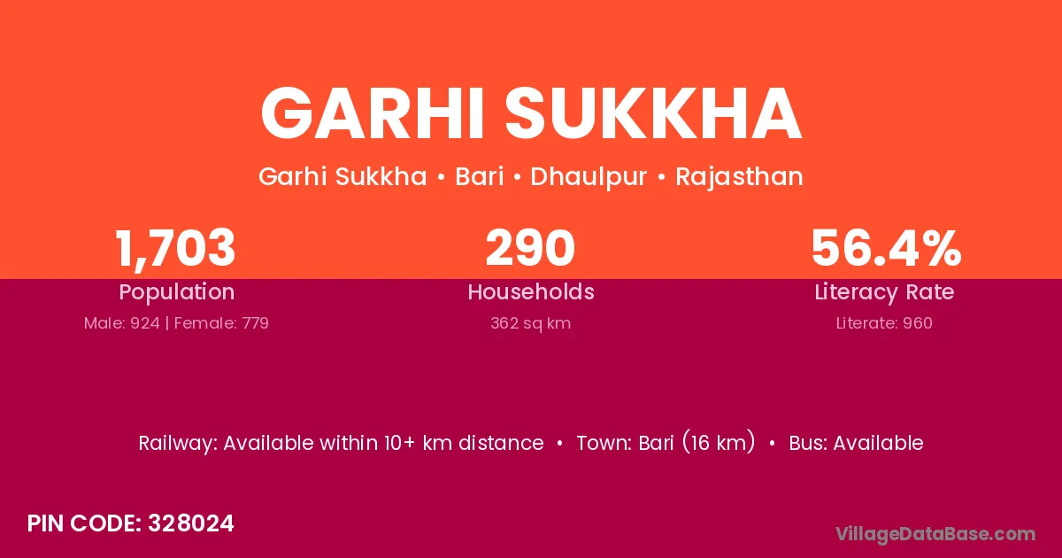 Bari (16 km) is the nearest town to Garhi Sukkha village for major economic activities and is located approximately 16 km away.