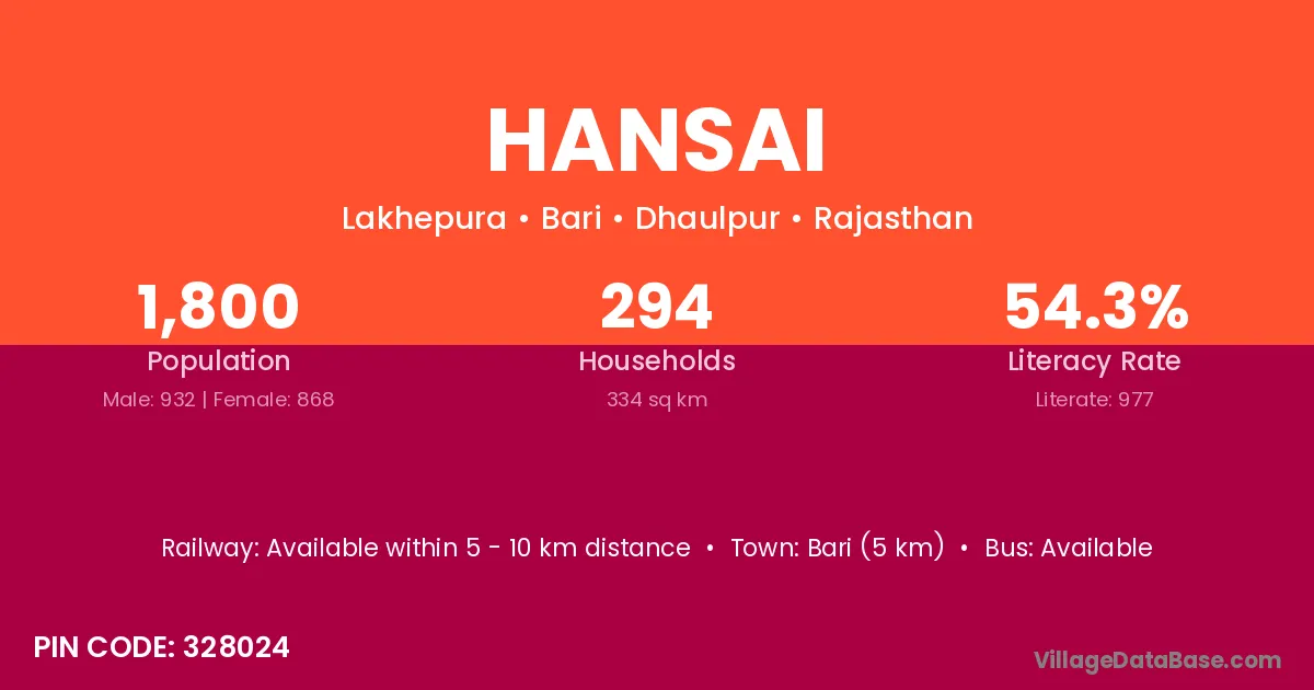 Bari (5 km) is the nearest town to Hansai village for major economic activities and is located approximately 5 km away.