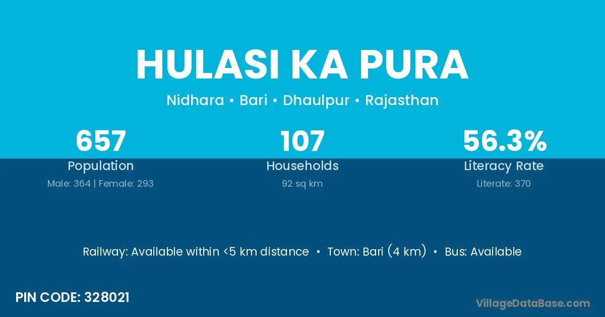 Bari (4 km) is the nearest town to Hulasi Ka Pura village for major economic activities and is located approximately 4 km away.