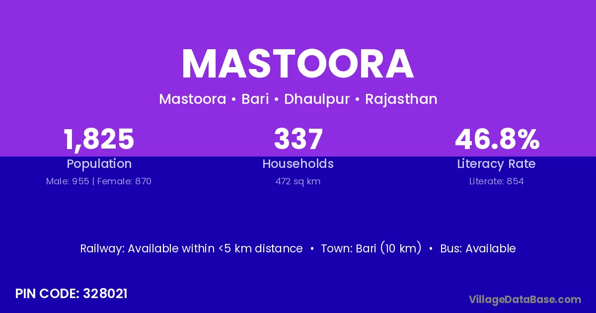 Bari (10 km) is the nearest town to Mastoora village for major economic activities and is located approximately 10 km away.