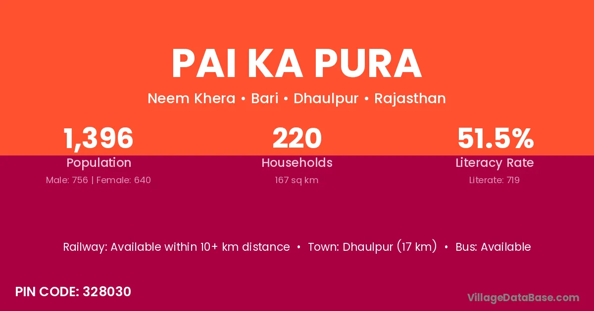 Dhaulpur (17 km) is the nearest town to Pai Ka Pura village for major economic activities and is located approximately 17 km away.