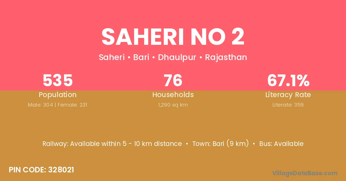 Saheri No 2 village has a total population of 535 people, of which 304 are males and 231 are females.