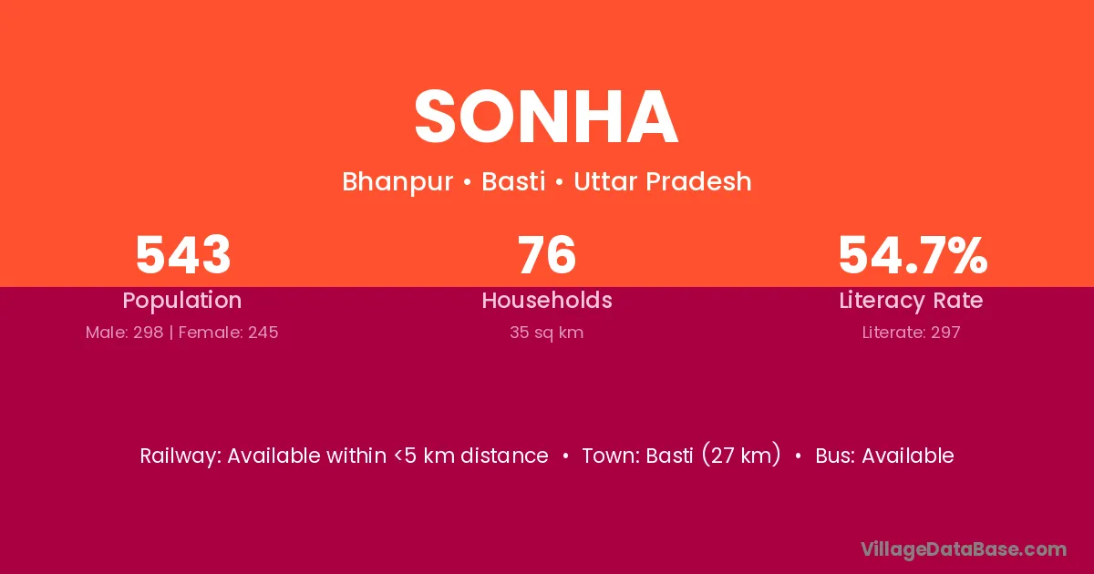 The literacy rate of Sonha village is 47.25%. Male literacy stands at 59.53% and female literacy at 31.14%.