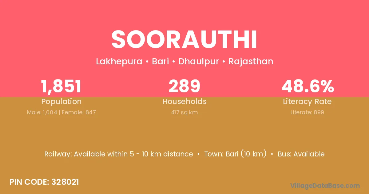 Bari (10 km) is the nearest town to Soorauthi village for major economic activities and is located approximately 10 km away.