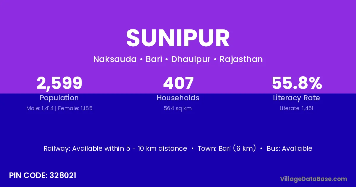 Bari (6 km) is the nearest town to Sunipur village for major economic activities and is located approximately 6 km away.