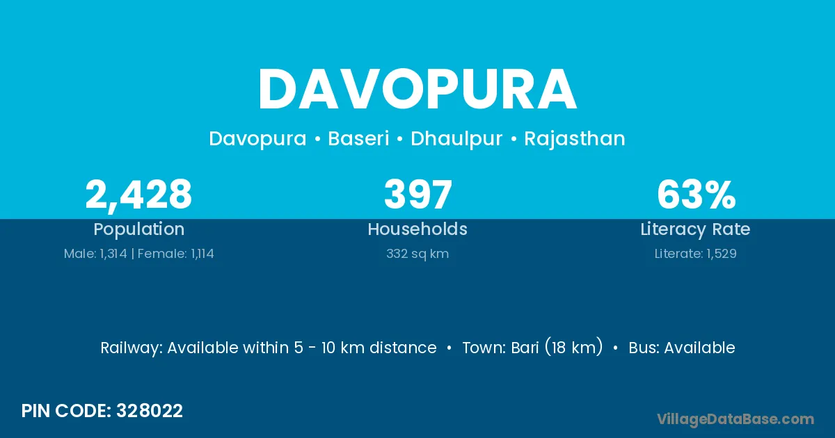 Bari (18 km) is the nearest town to Davopura village for major economic activities and is located approximately 18 km away.
