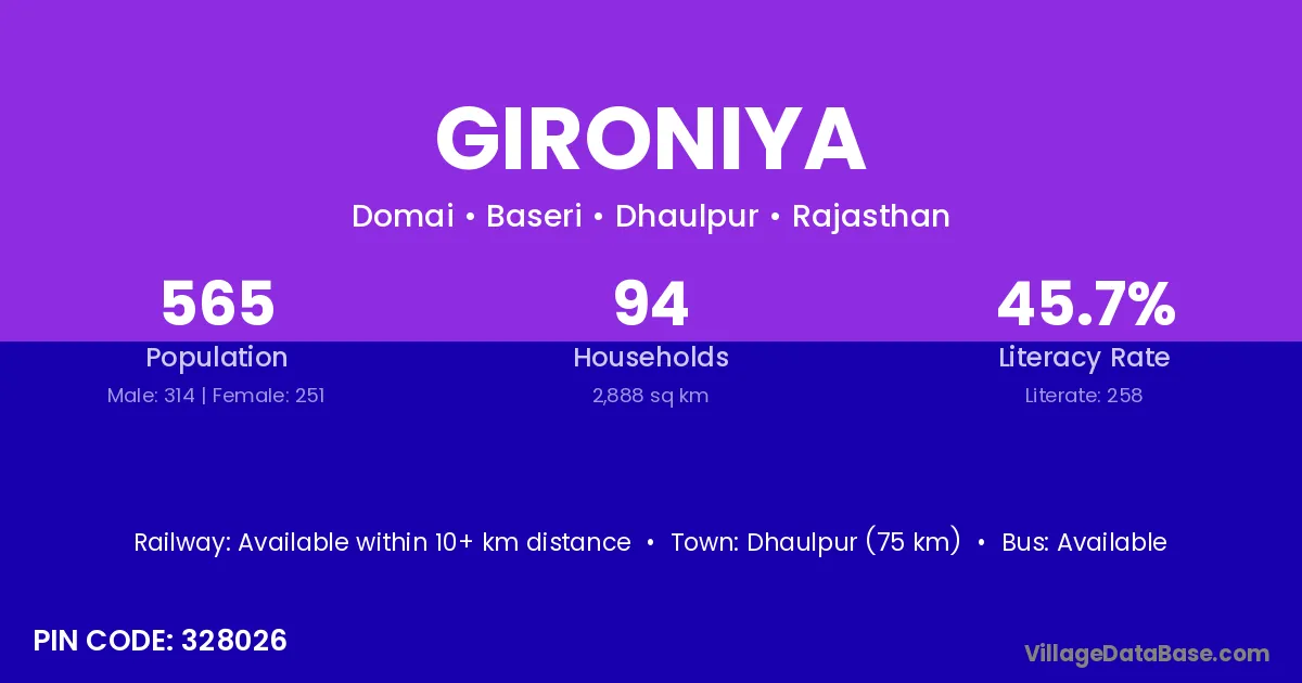 Dhaulpur (75 km) is the nearest town to Gironiya village for major economic activities and is located approximately 75 km away.