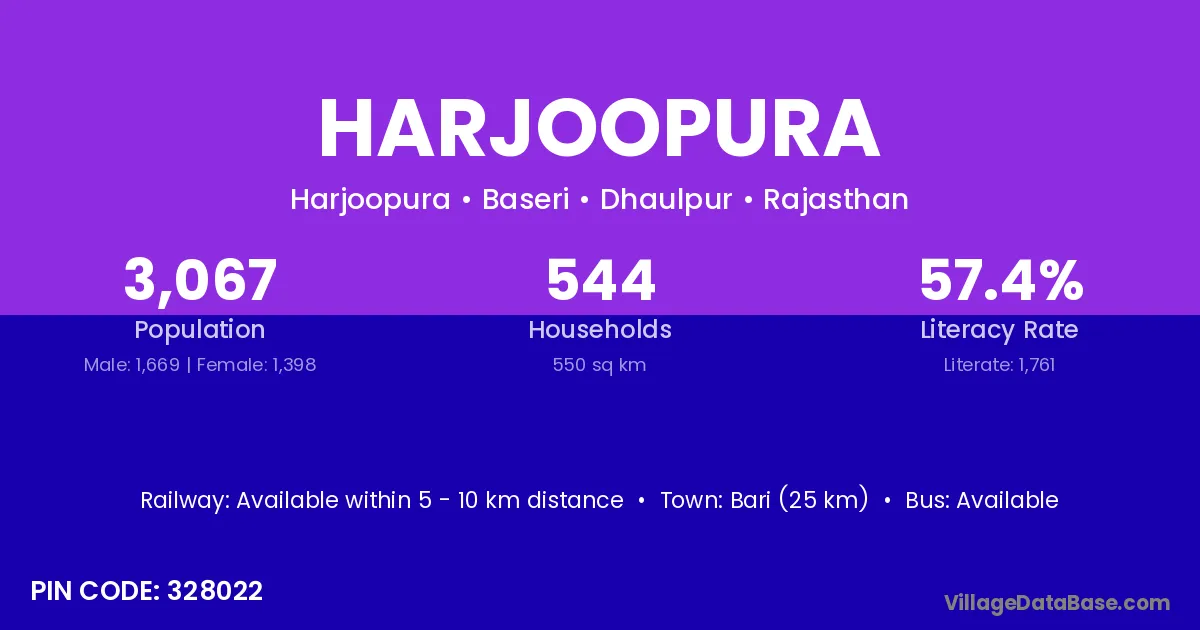 Bari (25 km) is the nearest town to Harjoopura village for major economic activities and is located approximately 25 km away.