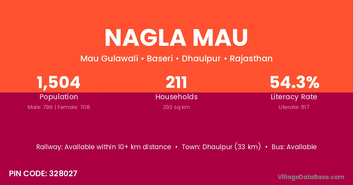 Dhaulpur (33 km) is the nearest town to Nagla Mau village for major economic activities and is located approximately 33 km away.