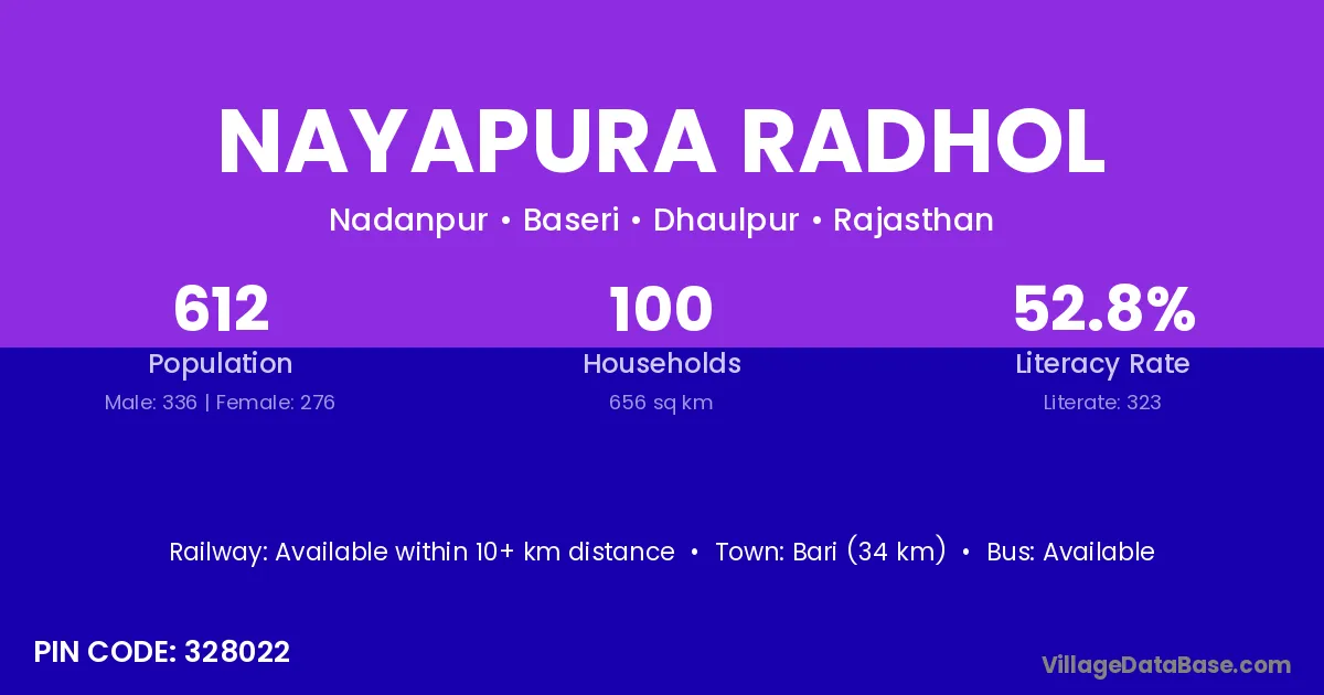 Bari (34 km) is the nearest town to Nayapura Radhol village for major economic activities and is located approximately 34 km away.