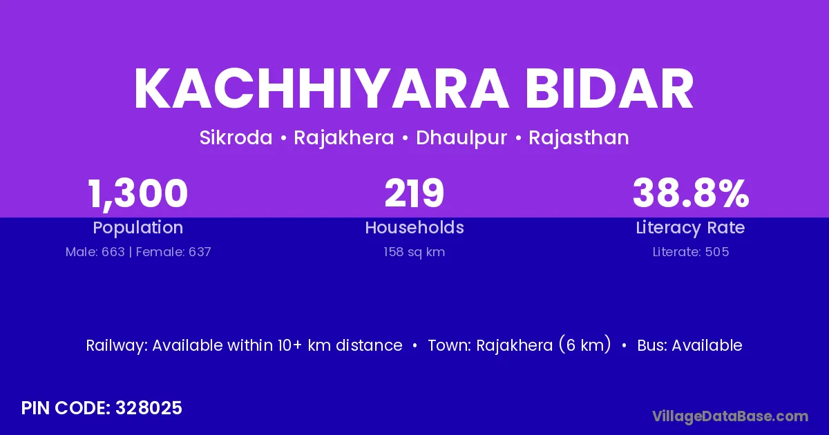 Rajakhera (6 km) is the nearest town to Kachhiyara Bidar village for major economic activities and is located approximately 6 km away.