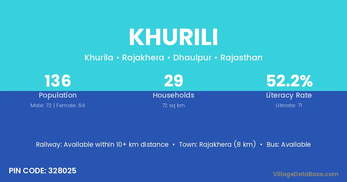 Rajakhera (8 km) is the nearest town to Khurili village for major economic activities and is located approximately 8 km away.