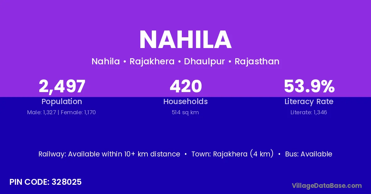 Rajakhera (4 km) is the nearest town to Nahila village for major economic activities and is located approximately 4 km away.