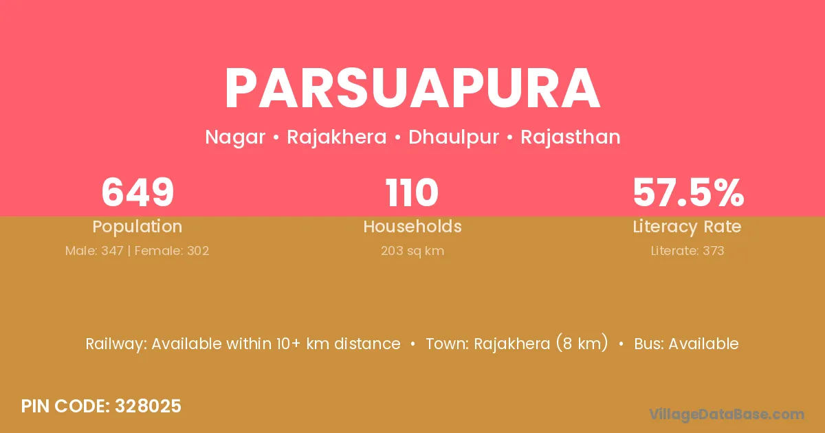 Rajakhera (8 km) is the nearest town to Parsuapura village for major economic activities and is located approximately 8 km away.