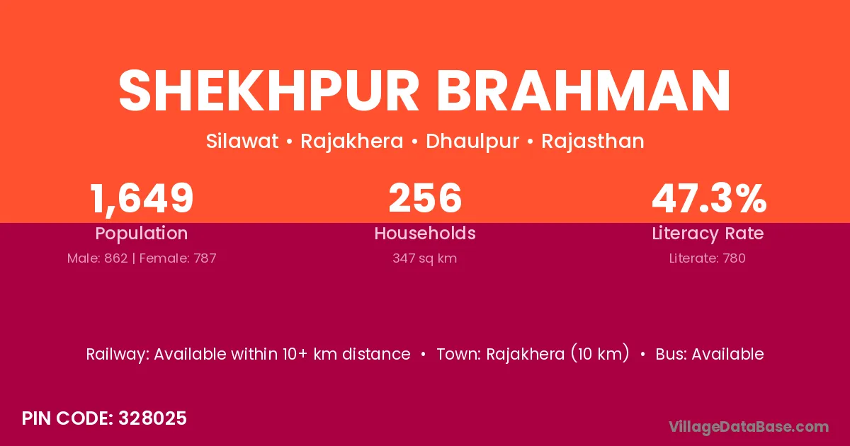Rajakhera (10 km) is the nearest town to Shekhpur Brahman village for major economic activities and is located approximately 10 km away.