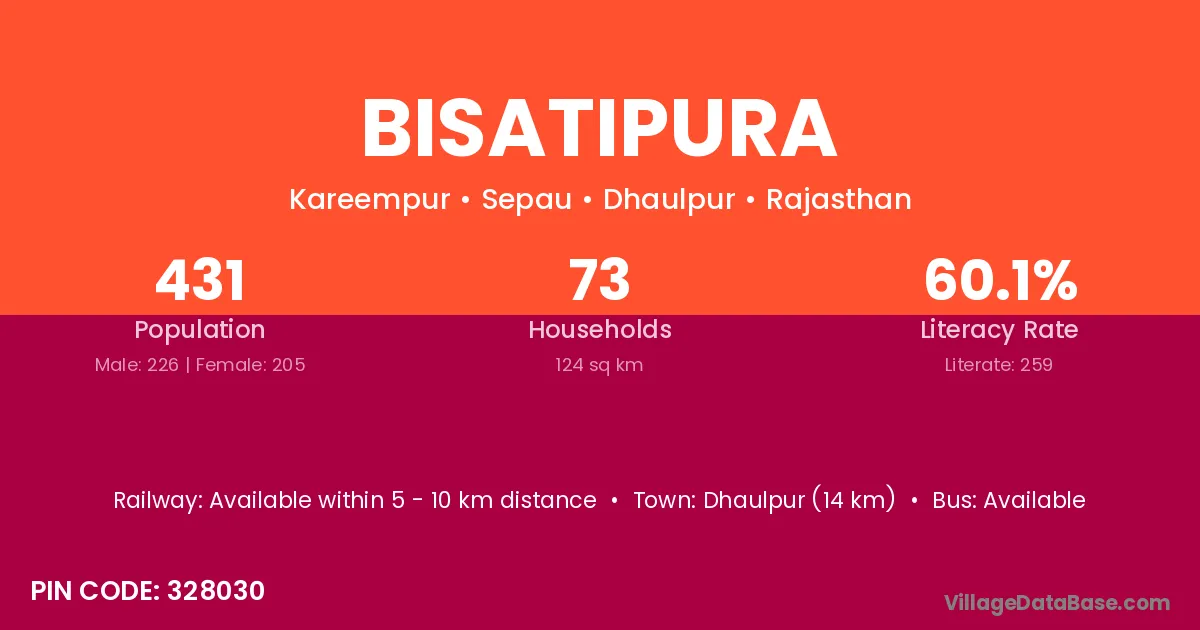 Dhaulpur (14 km) is the nearest town to Bisatipura village for major economic activities and is located approximately 14 km away.