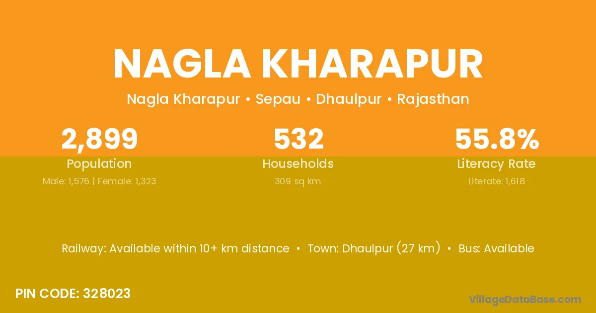 Dhaulpur (27 km) is the nearest town to Nagla Kharapur village for major economic activities and is located approximately 27 km away.