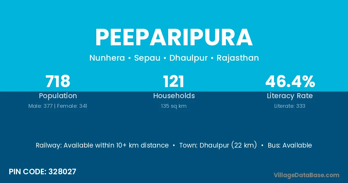 Dhaulpur (22 km) is the nearest town to Peeparipura village for major economic activities and is located approximately 22 km away.