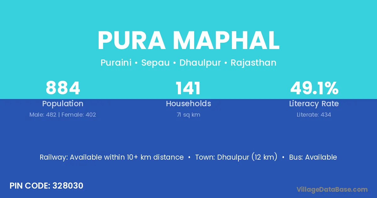 Dhaulpur (12 km) is the nearest town to Pura Maphal village for major economic activities and is located approximately 12 km away.