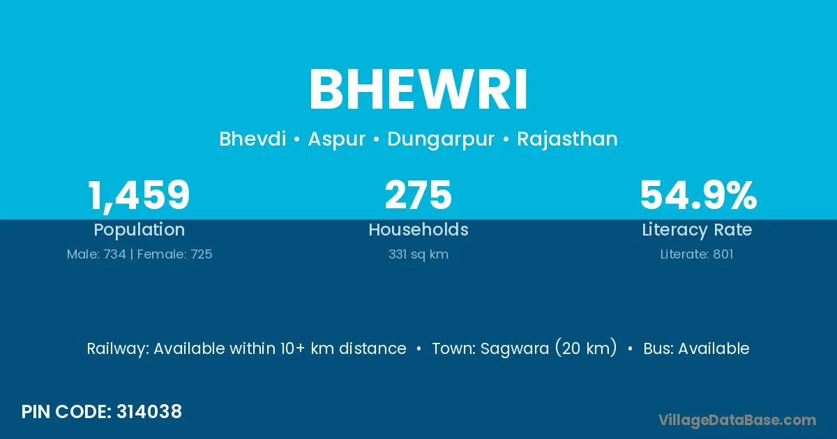 Sagwara (20 km) is the nearest town to Bhewri village for major economic activities and is located approximately 20 km away.
