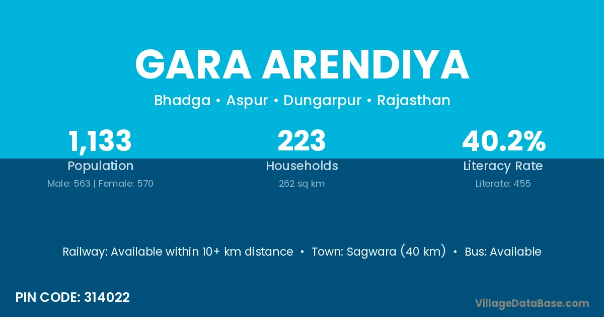Sagwara (40 km) is the nearest town to Gara Arendiya village for major economic activities and is located approximately 40 km away.