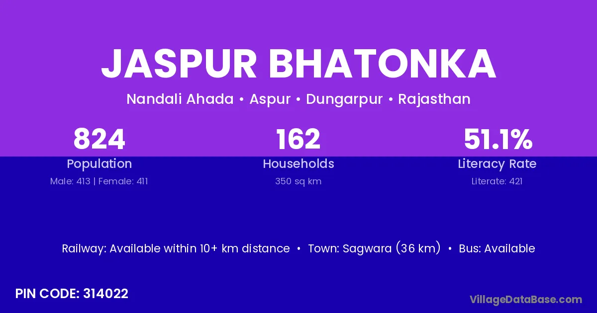 Sagwara (36 km) is the nearest town to Jaspur Bhatonka village for major economic activities and is located approximately 36 km away.