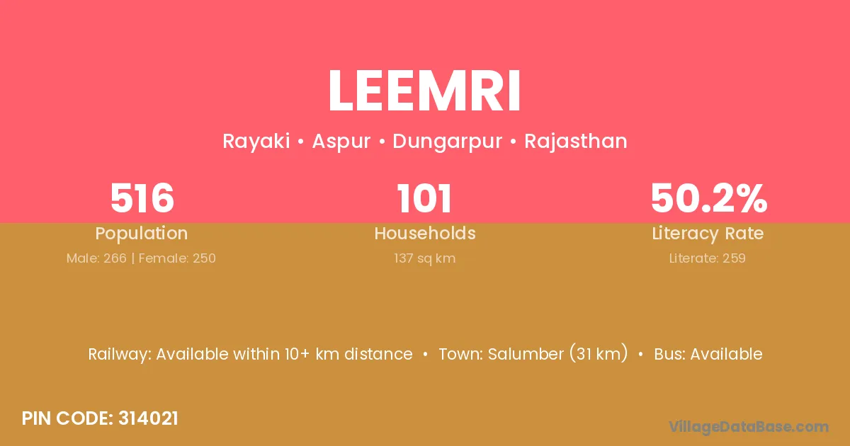Salumber (31 km) is the nearest town to Leemri village for major economic activities and is located approximately 31 km away.