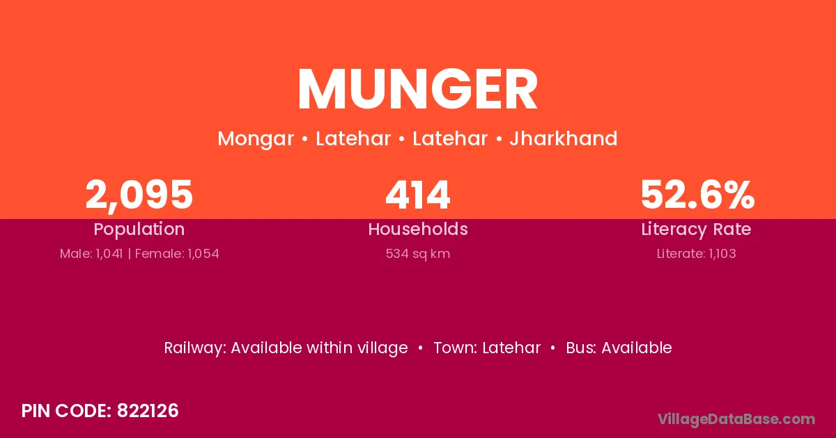 The literacy rate of Munger village is 57.07%. Male literacy stands at 67.04% and female literacy at 46.93%.