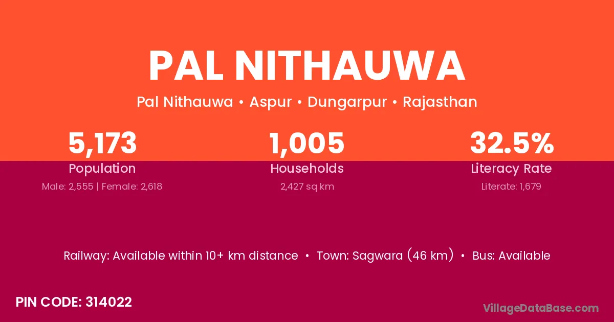 Sagwara (46 km) is the nearest town to Pal Nithauwa village for major economic activities and is located approximately 46 km away.