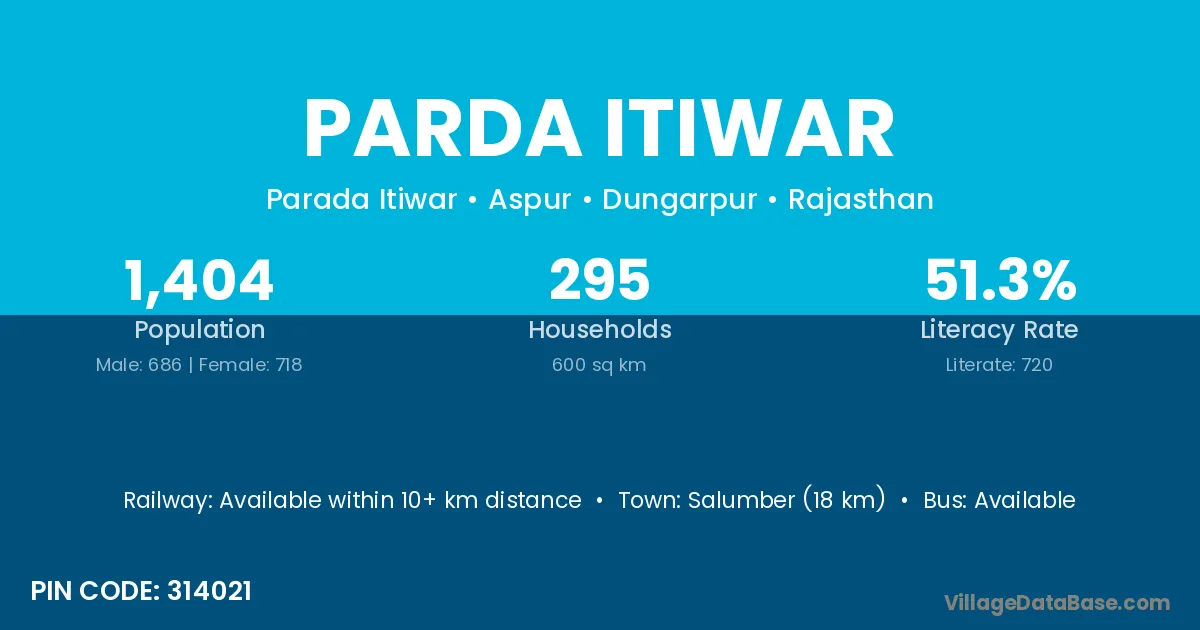 Salumber (18 km) is the nearest town to Parda Itiwar village for major economic activities and is located approximately 18 km away.