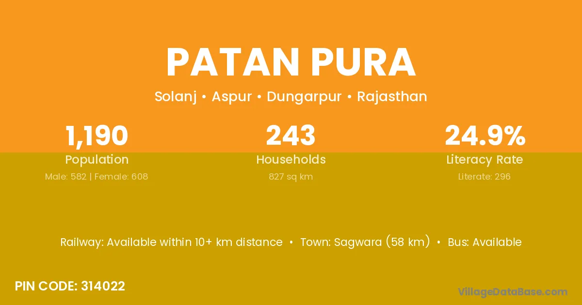 Sagwara (58 km) is the nearest town to Patan Pura village for major economic activities and is located approximately 58 km away.