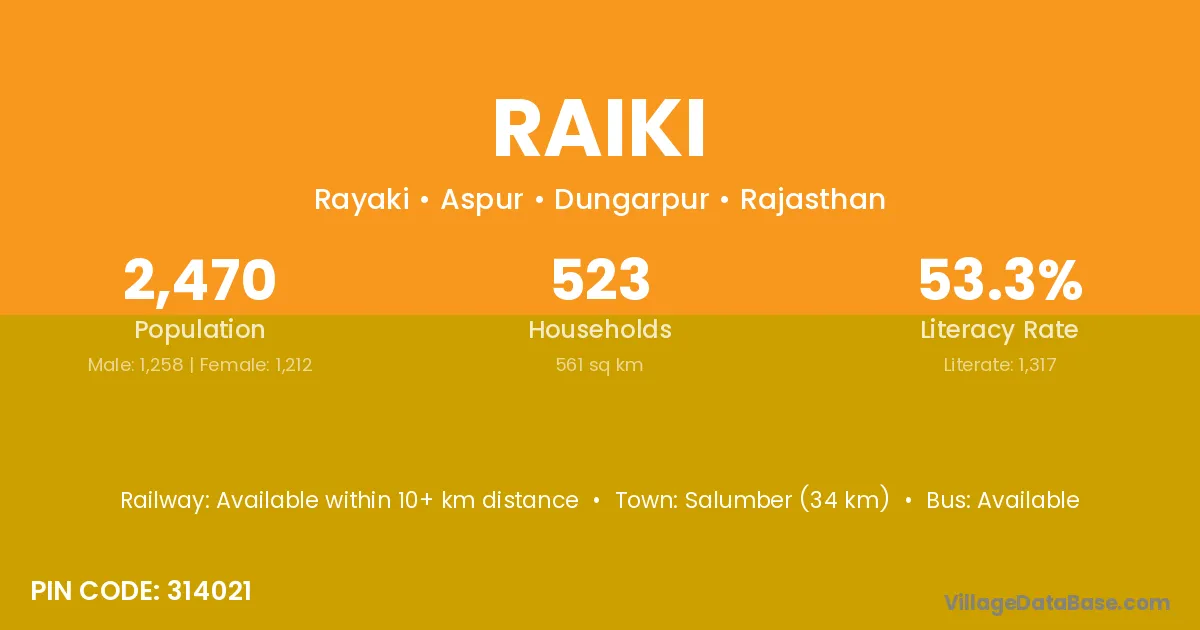 Salumber (34 km) is the nearest town to Raiki village for major economic activities and is located approximately 34 km away.