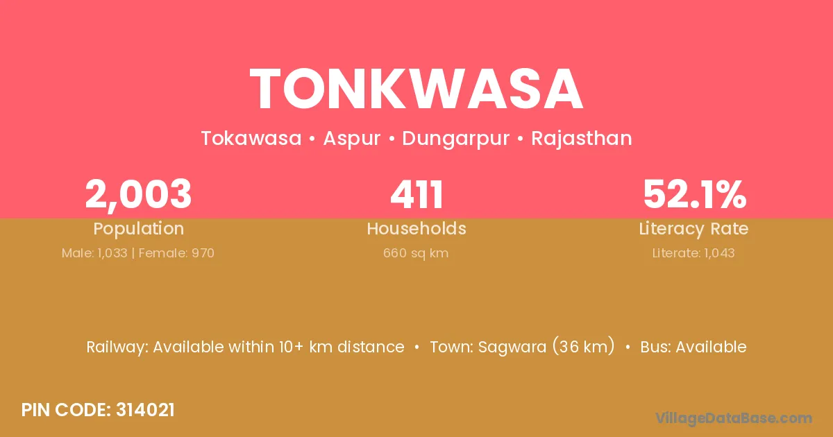Sagwara (36 km) is the nearest town to Tonkwasa village for major economic activities and is located approximately 36 km away.