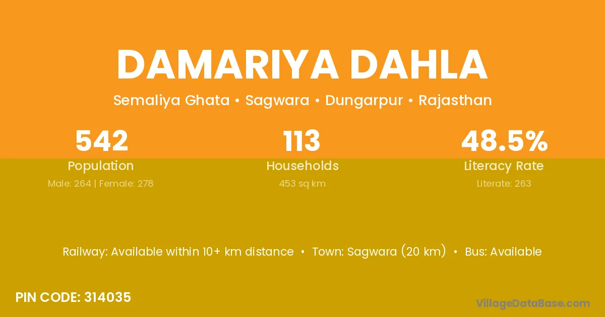 Sagwara (20 km) is the nearest town to Damariya Dahla village for major economic activities and is located approximately 20 km away.