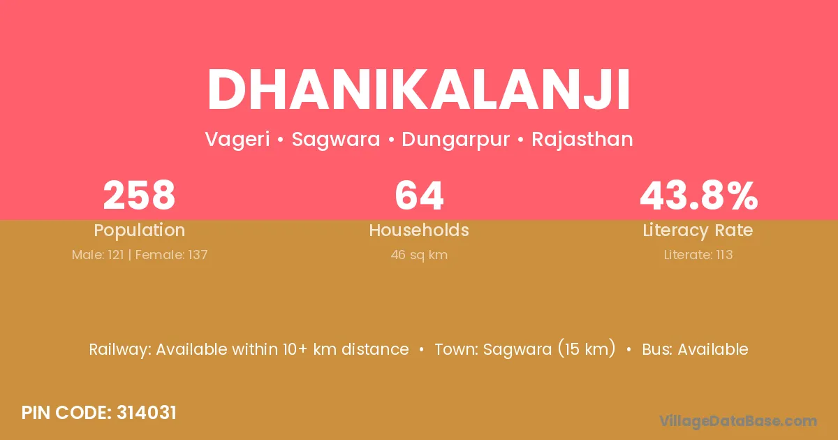 Sagwara (15 km) is the nearest town to Dhanikalanji village for major economic activities and is located approximately 15 km away.