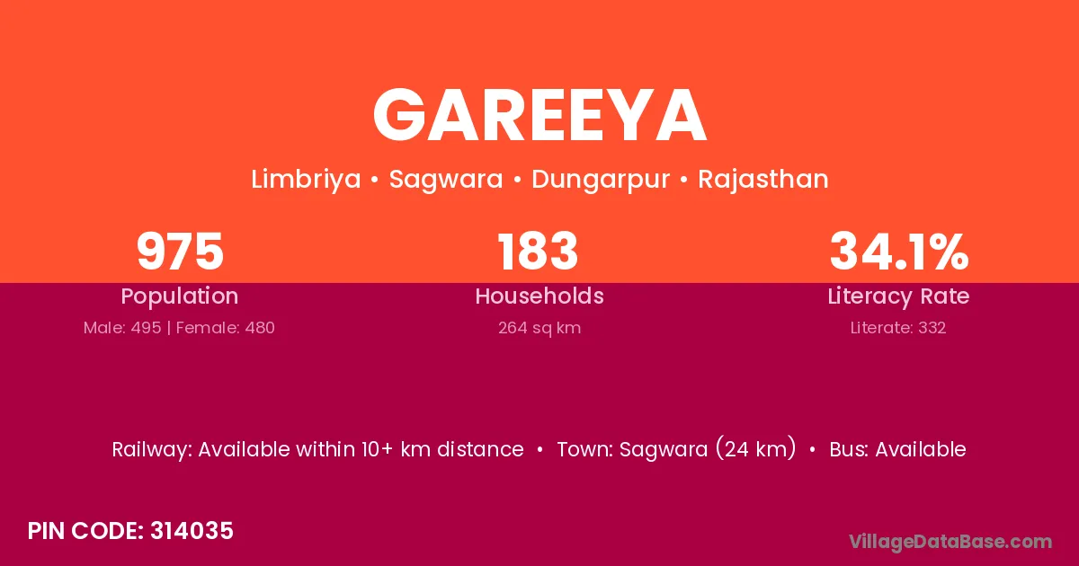Sagwara (24 km) is the nearest town to Gareeya village for major economic activities and is located approximately 24 km away.