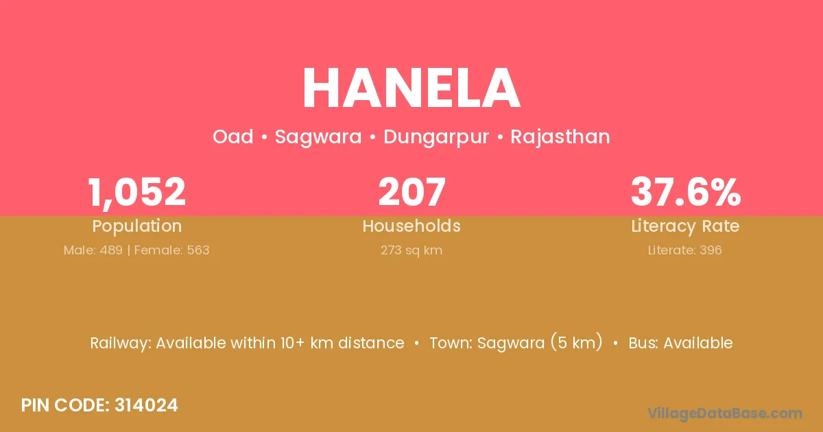 Sagwara (5 km) is the nearest town to Hanela village for major economic activities and is located approximately 5 km away.
