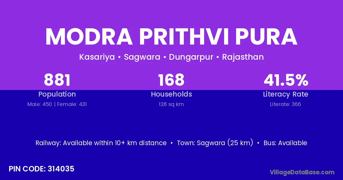 Modra Prithvi Pura village has a total population of 881 people, of which 450 are males and 431 are females.