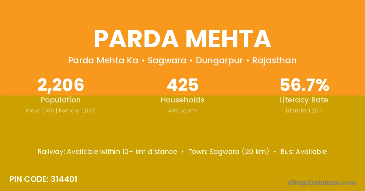 Sagwara (20 km) is the nearest town to Parda Mehta village for major economic activities and is located approximately 20 km away.