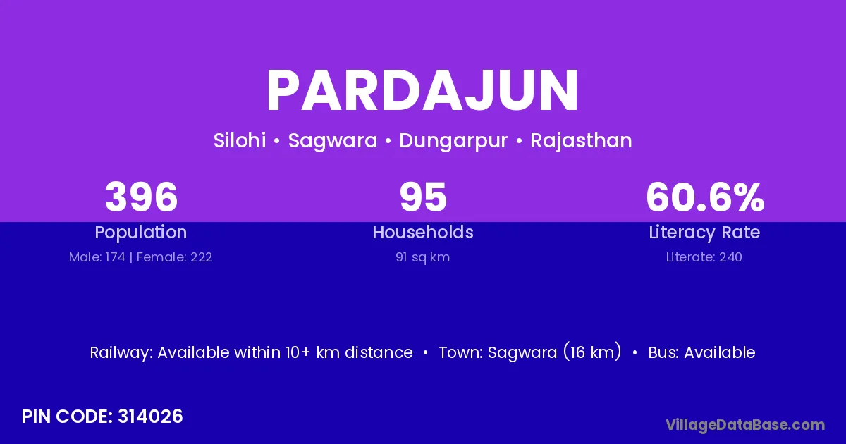 Sagwara (16 km) is the nearest town to Pardajun village for major economic activities and is located approximately 16 km away.