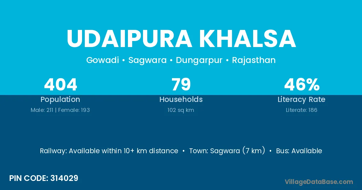 Sagwara (7 km) is the nearest town to Udaipura Khalsa village for major economic activities and is located approximately 7 km away.