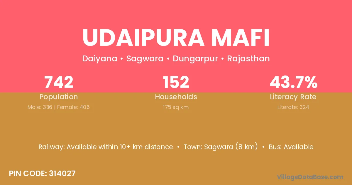 Sagwara (8 km) is the nearest town to Udaipura Mafi village for major economic activities and is located approximately 8 km away.