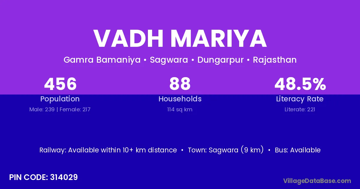 Sagwara (9 km) is the nearest town to Vadh Mariya village for major economic activities and is located approximately 9 km away.