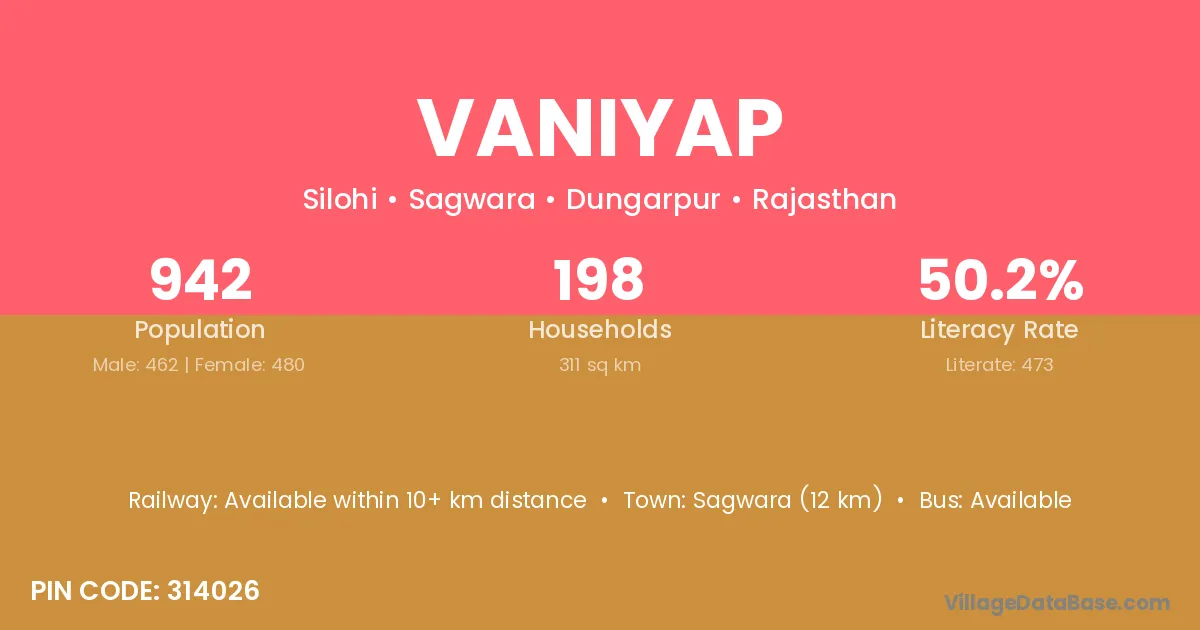 Sagwara (12 km) is the nearest town to Vaniyap village for major economic activities and is located approximately 12 km away.