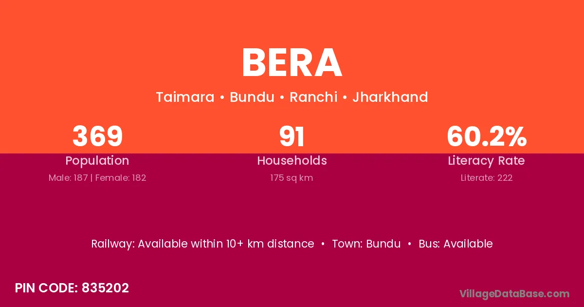 The literacy rate of Bera village is 36.93%. Male literacy stands at 45.40% and female literacy at 28.50%.