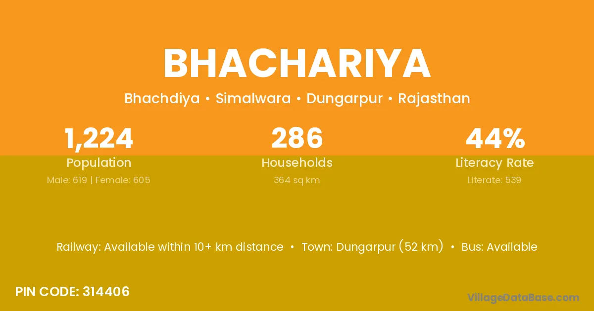Dungarpur (52 km) is the nearest town to Bhachariya village for major economic activities and is located approximately 52 km away.
