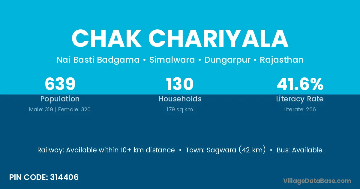 Sagwara (42 km) is the nearest town to Chak Chariyala village for major economic activities and is located approximately 42 km away.
