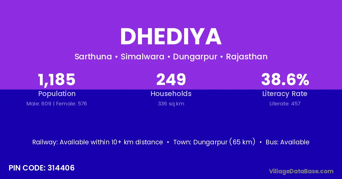 Dungarpur (65 km) is the nearest town to Dhediya village for major economic activities and is located approximately 65 km away.