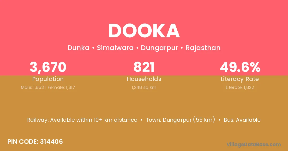 Dungarpur (55 km) is the nearest town to Dooka village for major economic activities and is located approximately 55 km away.